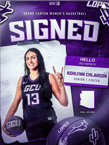 PHOENIX – Lookout world, Ashlynn’s back in town and sporting a new shade of purple. Pima and EAC former standout post player Ashlynn Chlarson is heading home. The 6’3″ junior center has committed to play women’s basketball for Grand Canyon University under head coach Winston Gandy.