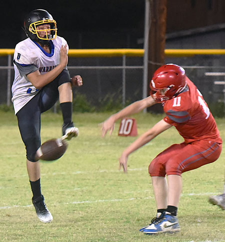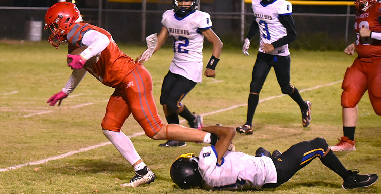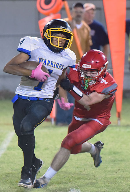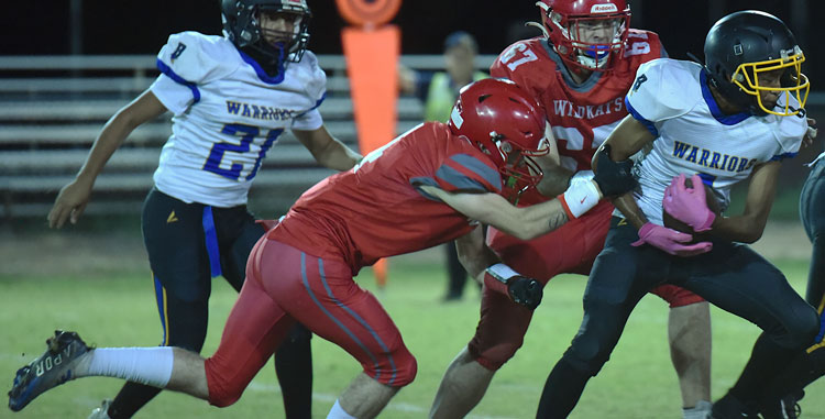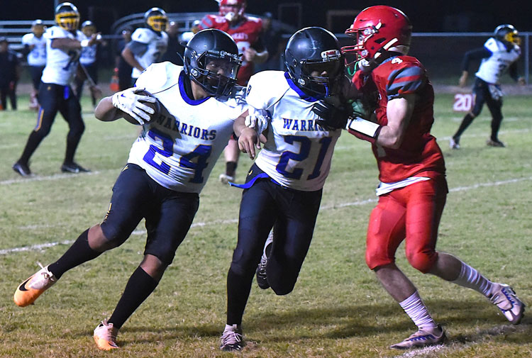 The visiting Warriors came within two points, 12-14, with 5:14 left in the first half, but the conversion run was stopped. Their ensuing possessions resulted in a turnover on downs and running out of time.