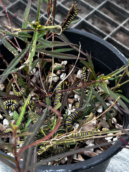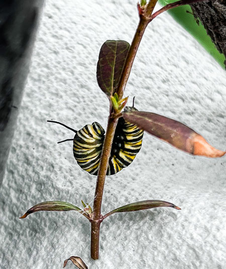 Feeding their tiny yet voracious appetites is somewhat of a challenge, given that Arizona milkweed is the only option grown at the nursery. The Plaths even drove to Pima to ‘borrow’ a potted milkweed (from the writer of this article) to share clippings with the critters.