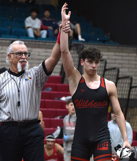 Wyatt (113) pinned senior Mitchell Ingram in 3:05, Nelson (120) pinned freshman Jackson Garrett in 4:50, Jeremiah Cano (126) pinned junior Jesus Canez-Quesada in 36 seconds, Sanchez (132) pinned junior Jaydin Castagno in 41 seconds, Williams (138) pinned freshman Walter Kelly in 19 seconds, Joseph Rodriguez (144) received a forfeit, Montes (150) pinned junior Kolltin Deskins in 56 seconds, Strickland (157) pinned sophomore Aiden Cargile in 2:51, Goodwin (175) posted a 15-0 technical fall over freshman Elijah Crouse, Chee (190) pinned junior Aiden Brown in 53 seconds, Davis (215) decisioned junior Tyson Kilpatrick 4-0, Cook (285) pinned sophomore Mason Stanley in 1:46.