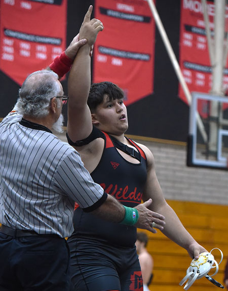 Rhyler Wyatt (113) went 3-0 with three pins, Ryder Nelson (120, 3-0, 3 pins), Jase Morgan (126, 1-0, 1 pin), Jeremiah Cano (126, 1-0, 1 pin), Hector Vasquez (126, 1-0), Anthony Sanchez (132, 2-0, 2 pins), Marcus Morgan (132, 1-0, 1 pin), Merrick Williams (138, 3-0, 2 pins), Joshwa Sandoval (144, 1-0, 1 pin), Joseph Rodriguez (144, 1-0), Damian Paz (144, 0-1), Emerson Montes (150, 3-0, 3 pins), Jesse Strickland (157, 2-1, 2 pins), Jacob Goodwin (165/175, 3-0, 2 pins), Zahia Cano-Nabor (175, 2-0), Dean Chee (190, 3-0, 2 pins), James Davis (215, 3-0, 1 pin), Cook (285, 2-0, 1 pin), and Joshua Roybal (285, 1-0).