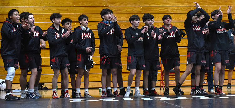 Rhyler Wyatt (113) went 3-0 with three pins, Ryder Nelson (120, 3-0, 3 pins), Jase Morgan (126, 1-0, 1 pin), Jeremiah Cano (126, 1-0, 1 pin), Hector Vasquez (126, 1-0), Anthony Sanchez (132, 2-0, 2 pins), Marcus Morgan (132, 1-0, 1 pin), Merrick Williams (138, 3-0, 2 pins), Joshwa Sandoval (144, 1-0, 1 pin), Joseph Rodriguez (144, 1-0), Damian Paz (144, 0-1), Emerson Montes (150, 3-0, 3 pins), Jesse Strickland (157, 2-1, 2 pins), Jacob Goodwin (165/175, 3-0, 2 pins), Zahia Cano-Nabor (175, 2-0), Dean Chee (190, 3-0, 2 pins), James Davis (215, 3-0, 1 pin), Cook (285, 2-0, 1 pin), and Joshua Roybal (285, 1-0).