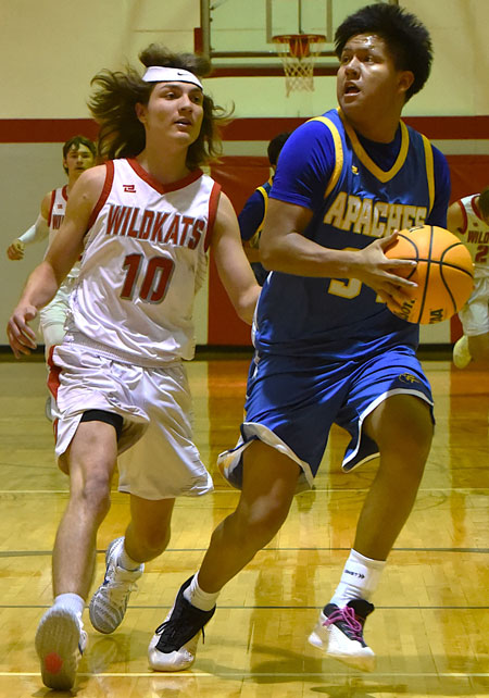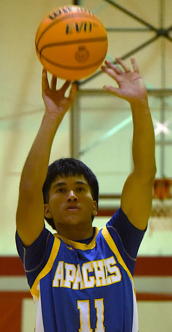 Raymundo Frasquillo Photo/Gila Herald: Channing Wilson (11) releases a first-quarter free-throw attempt, making 5-6. The Fort Thomas senior netted a game-high 17 points while inserted in only part of the game as Apache reserves accounted for 23 of 65 points.