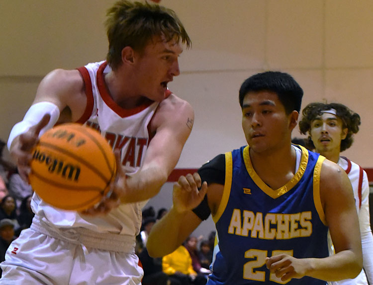 Raymundo Frasquillo Photo/Gila Herald: Taygan Jensen (22) looks for an open teammate while guarded by Fort Thomas sophomore Amare Ethelbah (15). The Duncan senior totaled six points and Ethelboh two. Morenci hosts Tombstone on Monday, Dec. 15, Duncan hosts Sam Simon, Fort Thomas hosts Superior (2-4), and Morenci visits San Carlos on Tuesday, Dec. 16, each with 7 p.m. starts.