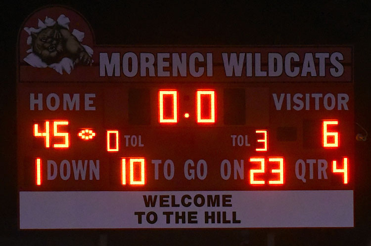 Morenci gained 25 yards before a no gain on 4th-and-1 turned the ball over on downs, covered 65 yards in 10 plays plus a 15-yard penalty to score on 2nd-and-goal from the three, covered 97 yards in seven plays plus a penalty, and twice took a knee to wind down the clock. Audre McCauley scored with 1:30 left in the third quarter, and Torres added the conversion kick. Anthony Rogers scored the final TD, and Torres added the conversion kick.