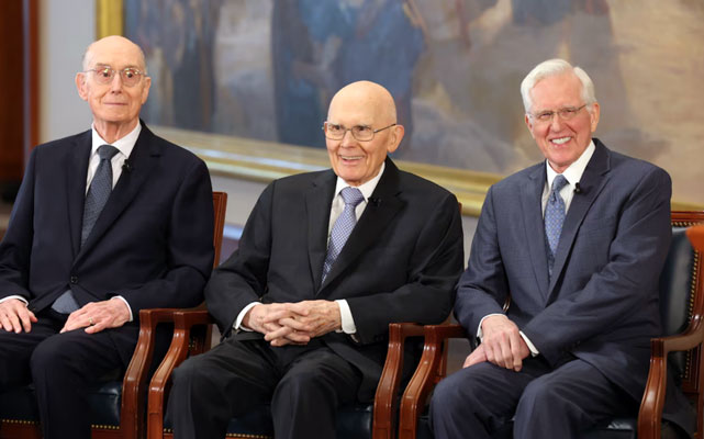 Photo Courtesy The Church of Jesus Christ of Latter-day Saints: From left, Henry B. Eyring, Dallin H. Oaks, and D. Todd Christofferson, the newly constituted First Presidency of The Church of Jesus Christ of Latter-day Saints, announced Tuesday, Oct. 14, 2025.