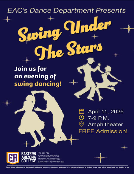 THATCHER — Eastern Arizona College’s Dance Department invites the community to step into an evening of rhythm, movement, and vintage flair at “Swing Under the Stars,” a free outdoor event set for April 11, from 7 to 9 p.m., at the EA Amphitheater.