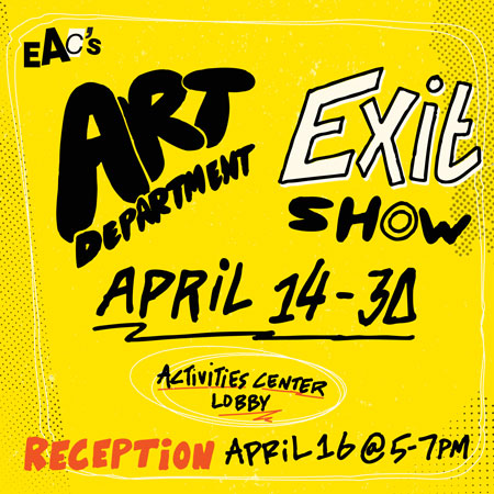 The Exit Show will run from April 14 to 30 in the Activities Center lobby, with a reception on April 16 from 5 to 7 p.m. This exhibition features the culminating work of EAC’s graduating art students, offering a final look at their artistic development before they move on to the next stage of their careers.
