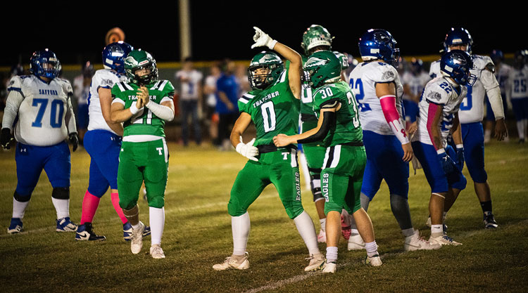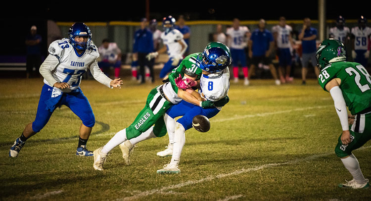 Safford then looked to tie after Whisman picked off Johnson and returned it into Eagles’ territory. Jacobson scrambled for a first down to the 32, but a holding call erased it, then a mishandled snap fumbled right into Thatcher’s lap at the Safford 33 to turn the ball over.