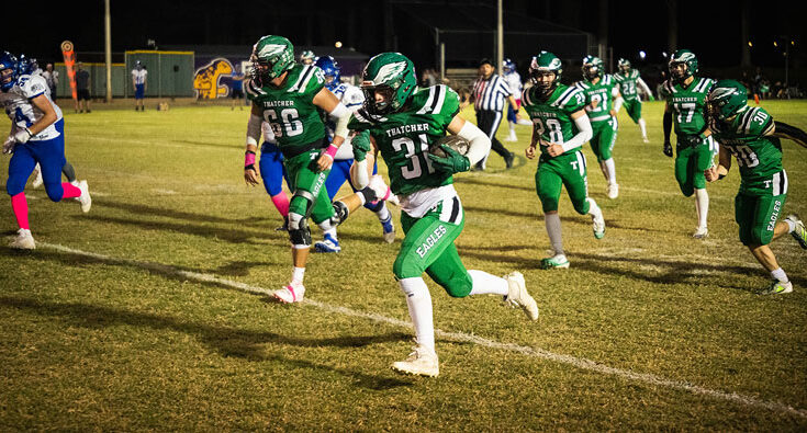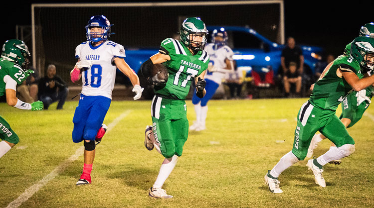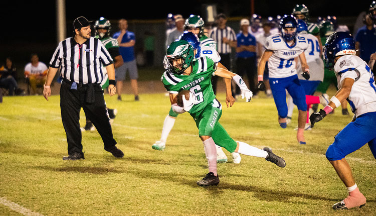 THATCHER – If you blinked during Friday night’s clash under the lights at John Mickelson Field on Friday, you might’ve missed an explosion that saw the Thatcher Eagles dismantle their arch-rivals, the Safford Bulldogs, 49-7.