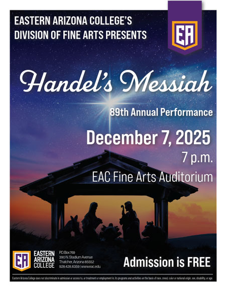 The concert will take place on Sunday, Dec. 7, at 7 p.m. in the Fine Arts Auditorium. From its tender opening to the triumphant “Hallelujah,” Messiah remains one of the Gila Valley’s most cherished and joyful holiday experiences.