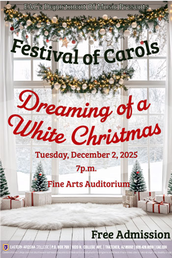 THATCHER — Eastern Arizona College’s Fine Arts Division invites the Gila Valley to two free holiday concerts filled with warmth, tradition, and the kind of musical magic families look forward to all year. At the heart of the season is EAC’s beloved Festival of Carols, the College’s annual gift to the community and a cherished way to kick off the holidays together.