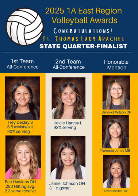 Their impressive regular-season performance earned the Lady Apaches the No. 10 seed in the 1A State Tournament. In the opening round, Ft. Thomas delivered one of the tournament’s early surprises, upsetting No. 7 Patagonia Union High School in a gritty, hard-fought match. The Lady Apaches advanced to the state quarter-final round, where they faced No. 2 seed North Phoenix Prep. Despite a determined effort, Fort Thomas fell short, ending their successful postseason run and closing out their season.