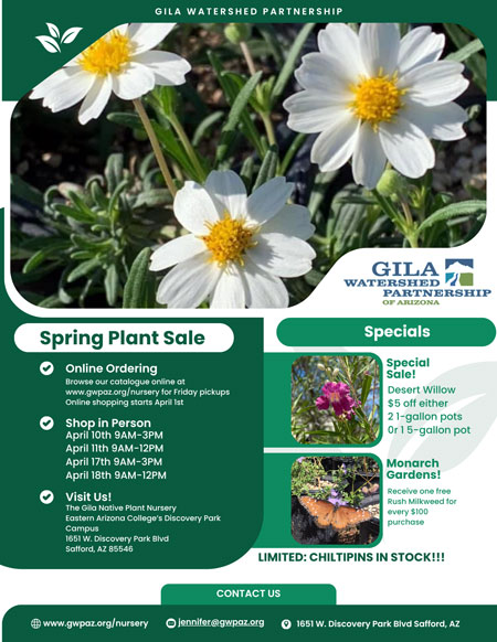 The Gila Native Plants Nursery annual Spring Plant Sale fundraiser is underway. Gila Watershed Partnership invites all members of the public to visit our website at gwpaz.org/nursery to purchase online throughout April, or to join us in person. The nursery will be open to the public on April 10 from 9 a.m. to 3 p.m., April 11 from 8 a.m. to noon, April 17 from 9 a.m. to 3 p.m., and April 18 from 9 a.m. to noon.