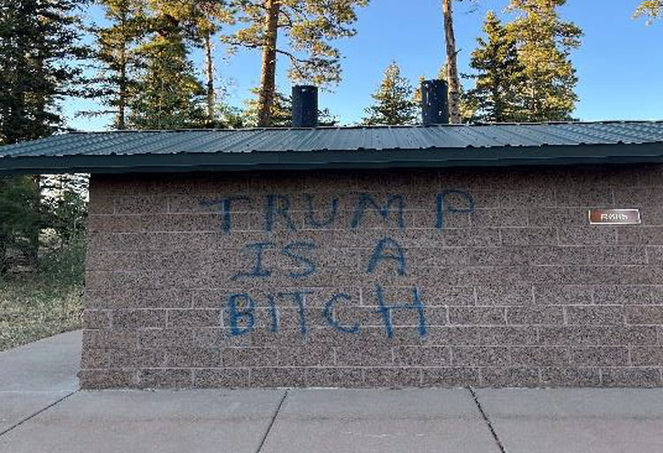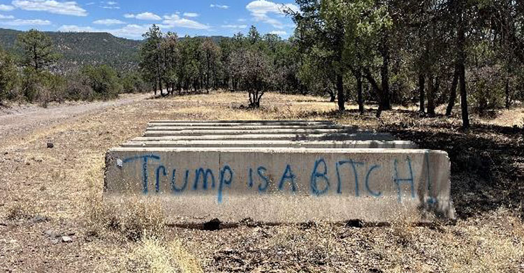According to investigative reports from the U.S. Forest Service and Greenlee County Sheriff’s Office, the vandalism began around June 3, 2025, and included the cutting of two large government-owned water tanks on Red Hill Road, spray-painted anti-Trump graffiti on multiple structures, including a cement barricade and rock embankment, and the destruction of a white watering trough. An American flag was also torn down from a post along Blue River Road. Estimated damage to the Forest Service tanks and trough alone exceeded $13,400, not including labor costs.