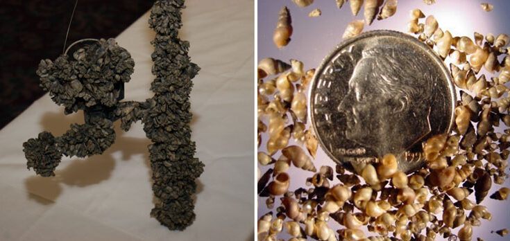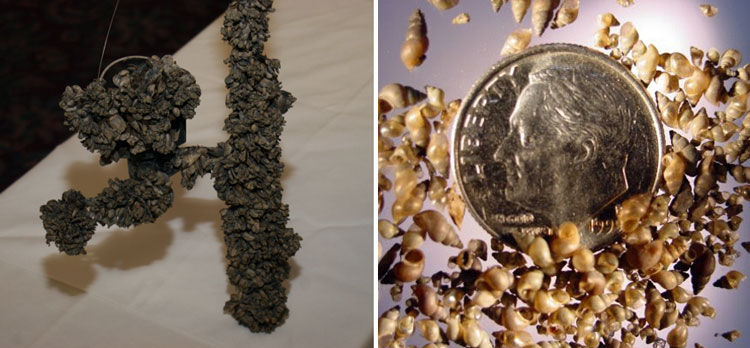 Contributed Photo/Courtesy AZGFD: Left photo: Quagga mussels attached to a fishing rod and reel | Right photo: Tiny New Zealand mudsnails.