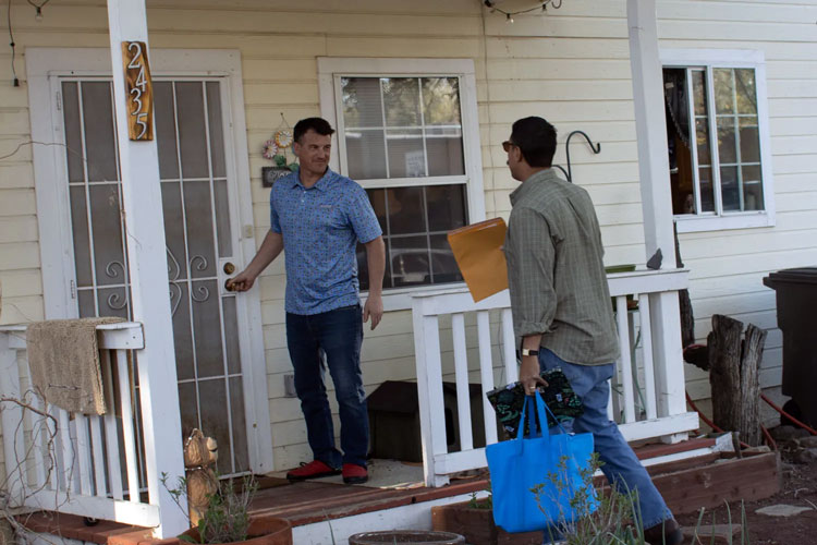 Jermaine Barkley walks door-to-door to hand out ICE encounter information packets on April 8, 2026. (Dermont Stevenson/Cronkite News)