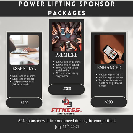 This competition isn’t just about lifting weights; it’s a prime opportunity for local businesses and brands to connect with a passionate, health-conscious audience. By sponsoring the JD3 Safford Powerlifting Competition, you’ll gain visibility among hundreds of attendees, participants, and our broader community network. All sponsors will be prominently announced during the event on July 11, putting your name in the spotlight amid the excitement.
