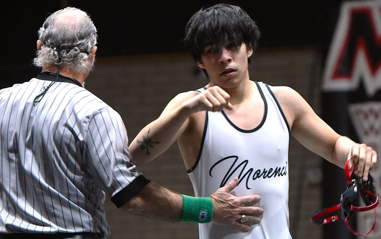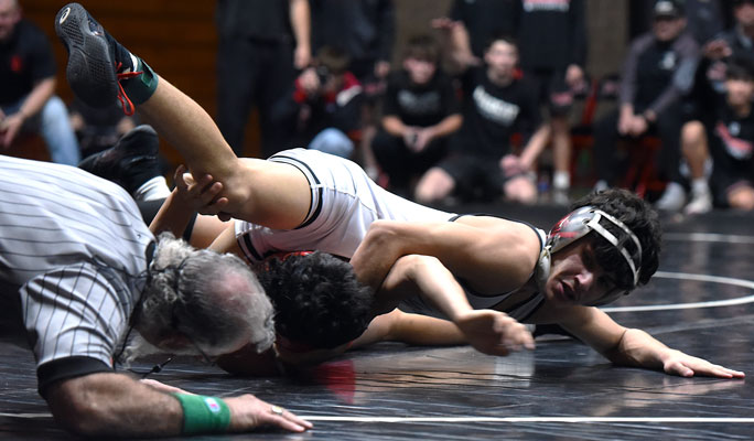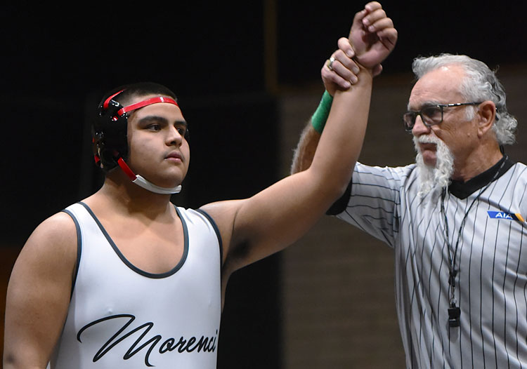 Morenci’s five champions included freshman Ryder Nelson (106, 2-0, 2 pins), freshman Anthony Sanchez (120, 3-0, 3 pins), junior Kiano Torres (138, 4-0, 4 pins), sophomore Emerson Motes (144, 3-0, 2 pins), and senior Hollis Corbell (190, 2-0, 2 pins).