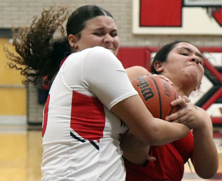 Raymundo Frasquillo Photo/Gila Herald: Rozlyn Funari (10) battles for rebounding position with Willcox junior Maddie Bennett (14) during a Dec. 6 home game. The Morenci sophomore netted 15 points against the Cowgirls. Morenci hosts region leader Benson on Monday, Dec. 18.