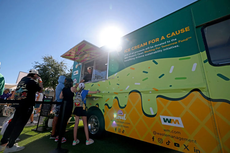 The Arizona-based company Novel Ice Cream hands out ice cream to attendees of the WM Phoenix Open at the Tournament Players Club in Scottsdale, Ariz., on Feb. 4, 2026. Novel Ice Cream created a new green flavor just for the tournament, and they plan to donate 20% of all sales to the WM Phoenix Open Working For Tomorrow Fund. (Photo by Sydney Lovan/Cronkite News)