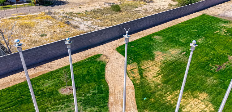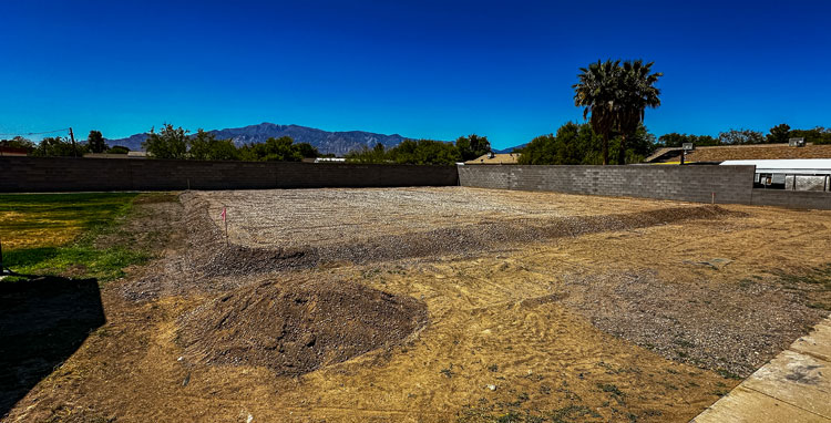Peterson Landscaping has completed the landscaping phase, including tree planting, grass installation, brick walkways, rockwork, and landscaping around the flagpoles. Earlier work included pouring concrete, installing multiple flagpoles, and constructing a block wall. A pad has also been prepared on the same site for the future Pima Library building.