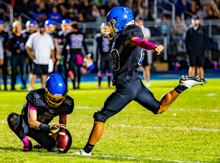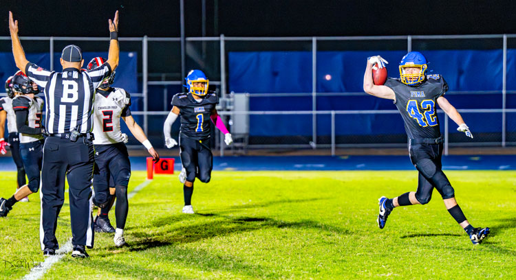 And on the very next play, Rooster Allred burst through the line, kept his balance, and dove into the end zone for the score. Haydn Wilkins’ extra point was good, and Pima was up 13-0 with 5:56 left in the half.