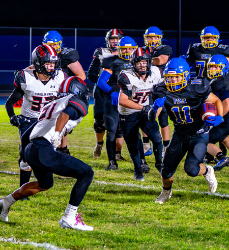 Dodson tossed a deep pass that Aaron Crawford hauled in at Pima’s 18 for 28 yards, and the Titans were in business. But after a Charlie Richardson sack, Chandler Prep faced a 3rd and 14 from the 22 with 25 seconds left. The defense swarmed Dodson as he dropped back and forced him to scramble. Dodson dodged and weaved his way and headed to the end zone when he collided with Rooster Allred at the goal line.