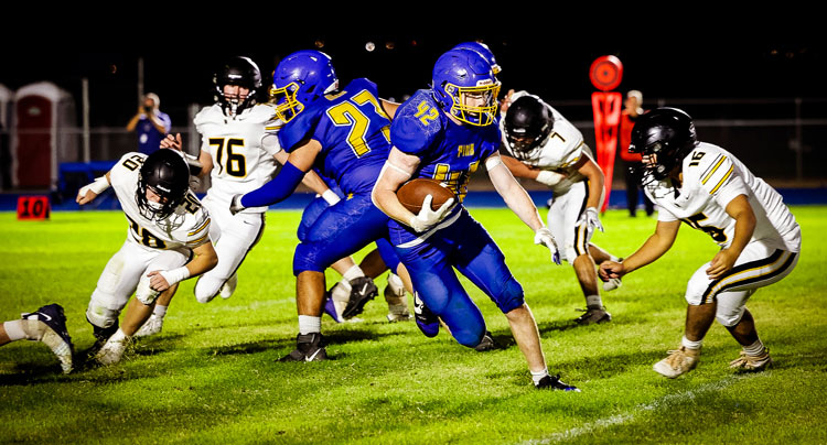 Photo By Stan Bonifacio Sports Photography: Pima's Joe Palmer looks for an opening. Round Valley spoiled Pima's new field opener 36-0.