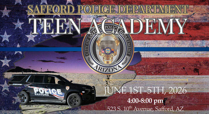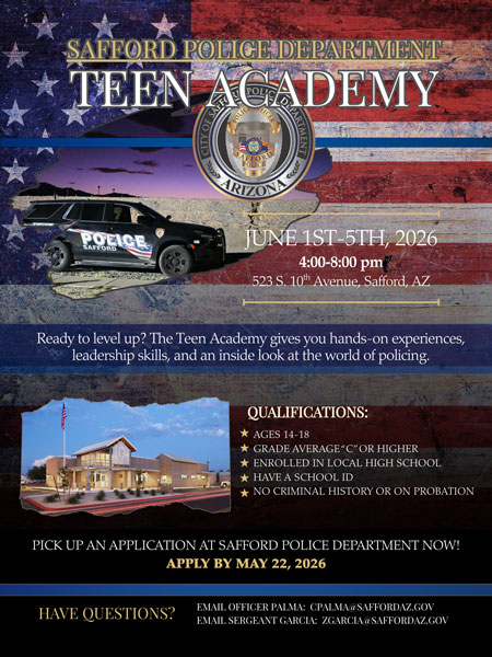 SAFFORD — The Safford Police Department invites local teens to apply for its upcoming Teen Academy, a five-day program that offers a hands-on introduction to law enforcement and leadership development. The academy will take place June 1–5 from 4 to 8 p.m. at the Safford Police Department.