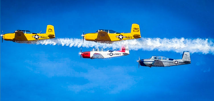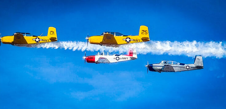 The afternoon ramped up with formation flights, including a trio of T-6 Texan trainers and T-34 Mentors, their synchronized loops drawing cheers from the crowd.