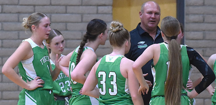 Raymundo Frasquillo Photo/Gila Herald: Thatcher head coach Brandon Lunt addresses the Eagles during a time out. The Eagles hosts Payson, Pima hosts Benson, and Fort Thomas hosts Dishchii’bikoh on Tuesday, Dec. 2. All three contests start at 5:30 p.m.