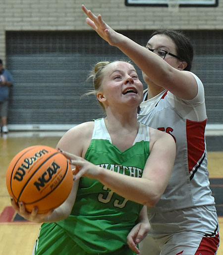 Raymundo Frasquillo Photo/Gila Herald: Taylor Henrie (33) draws a foul from Morenci sophomore Arisela Salazar, her fifth, as she drives to the basket. The Thatcher junior totaled two points, and Salazar did not score.