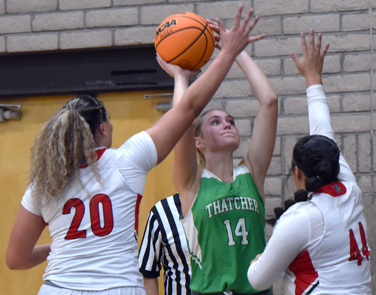 Raymundo Frasquillo Photo/Gila Herald: Jocelyn Lunt (14) attempts a field goal over the outstretched hands of Morenci defenders, junior Tiara Jones (20) and senior Jaliyah Hernandez (44). The Thatcher sophomore ended with five points, Jones 21, and Hernandez did not score.