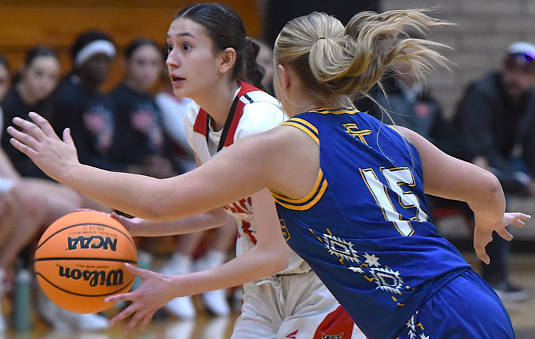 Raymundo Frasquillo Photo/Gila Herald: Jaylianna Guzzo (1) looks to pass the ball as Fort Thomas senior Raeleigh Hawkins (15) tries to prevent it. Guzzo scored six points and Hawkins four.