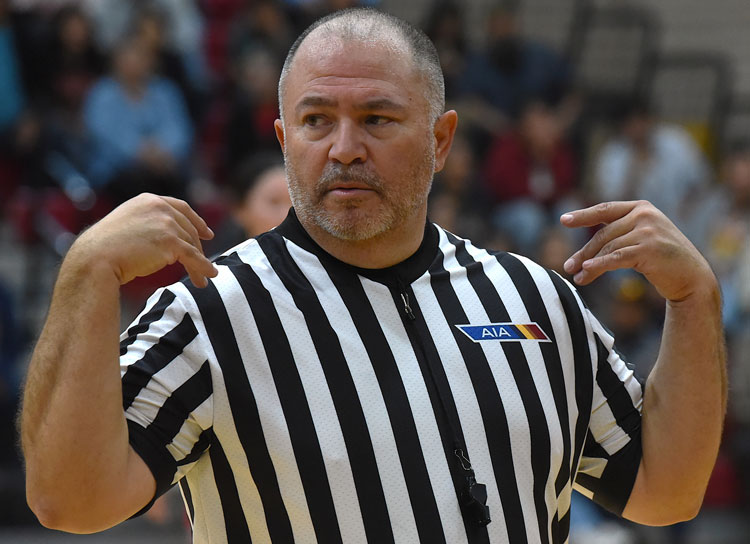 Raymundo Frasquillo Photo/Gila Herald: Area official Brian Avila indicates a 30-second timeout during the Morenci – Fort Thomas game.