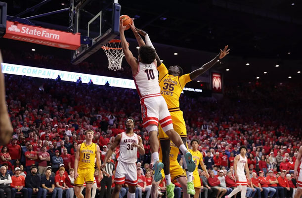 Arizona’s Koa Peat dunks over ASU en route to a 89-82 victory to remain unbeaten. (Photo courtesy of Arizona Athletics)