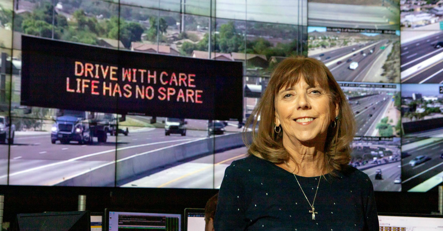 Photo Courtesy ADOT: Dori Brock, of Casa Grande, submitted the winning message, “Drive with care, life has no spare.”